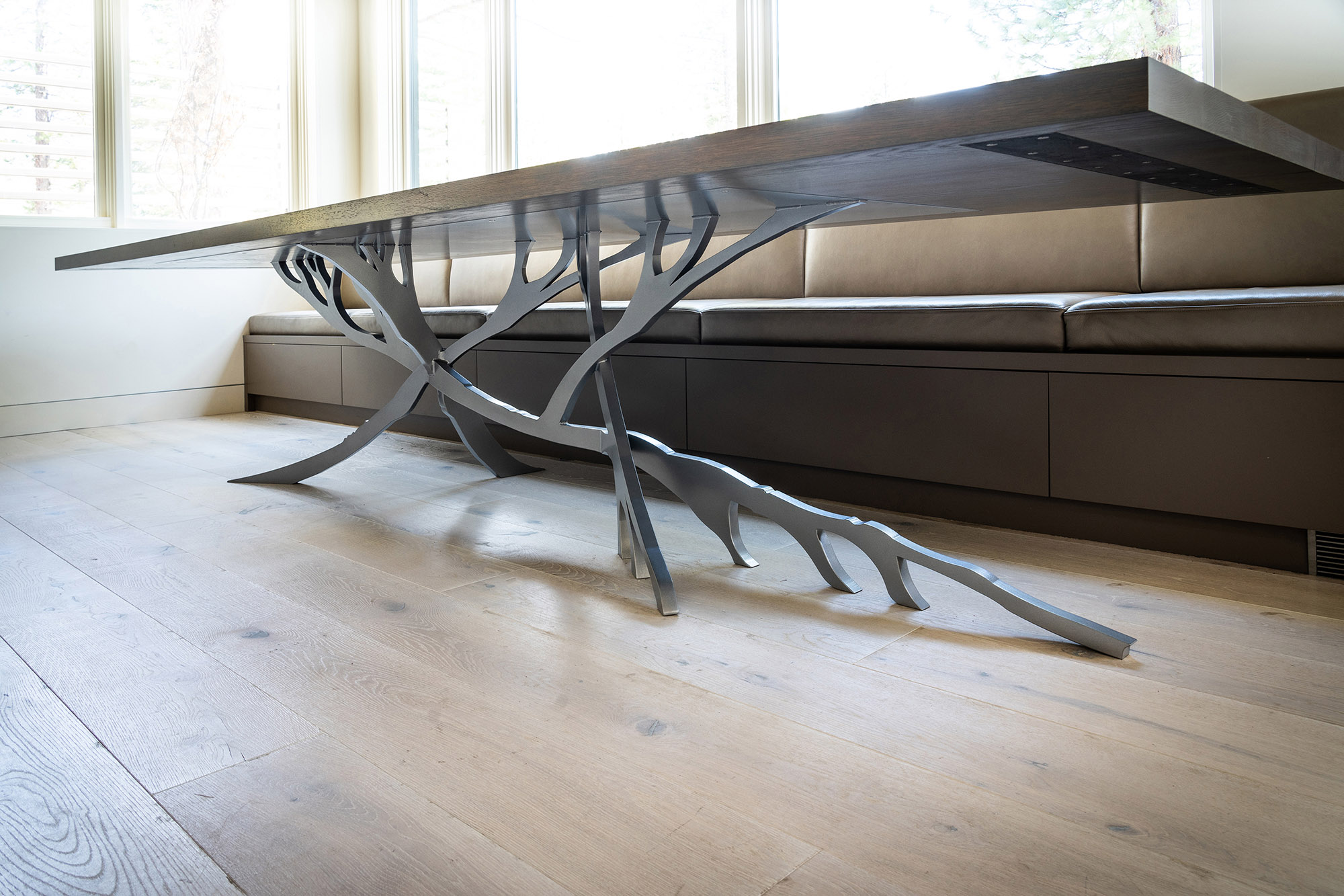 This refined 12-foot modern dining table was crafted from solid 2" thick oak with a stunning solid powder-coated steel branch-looking base that was inspired by the natural Tahoe landscape.